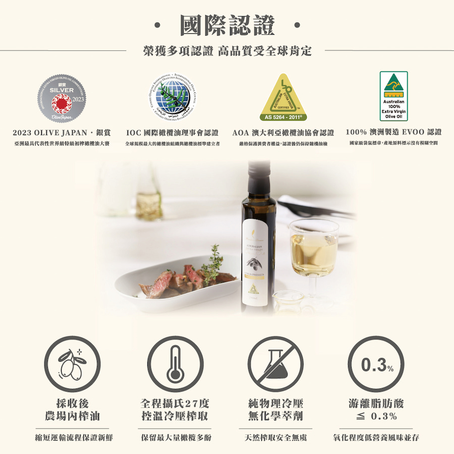 ・澳洲原裝進口,通過三大國際認證:IOC 國際橄欖油協會、AOA 澳大利亞橄欖油協會、100% 澳洲製造 EVOO 認證