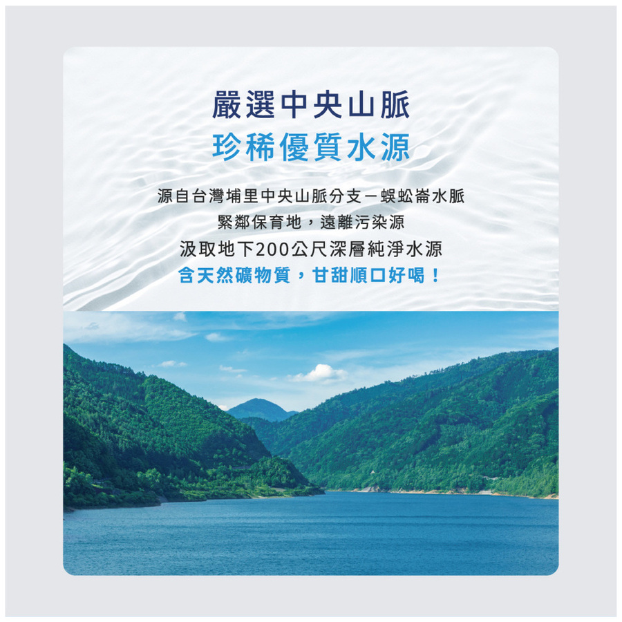 源自台灣埔里中央山脈分支-緊鄰保育地的珍稀蜈蚣崙水脈,遠離污染源。含天然礦物質,甘甜順口好喝。